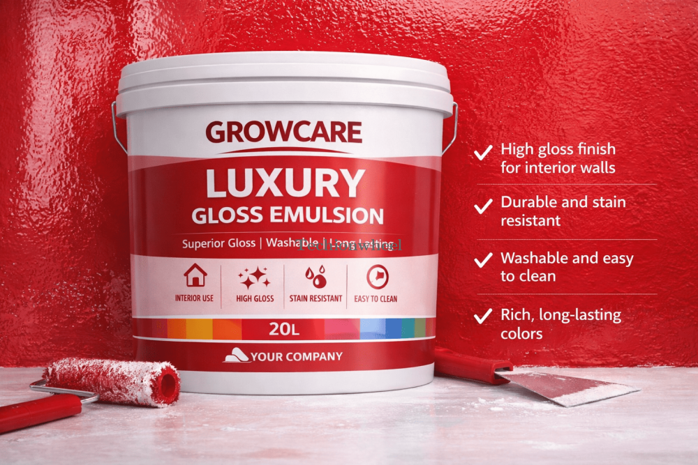 Description: Growcare Luxury gloss emulsion is a high sheen, ultra-premium, durable interior emulsion that offers a differentiated luxurious look and finish on the walls.